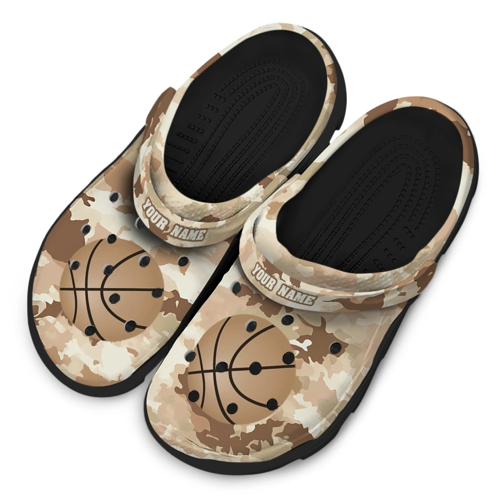 Basketball Logo Clog – Customized Desert Camo Tan blends rugged desert camo style with sporty basketball graphics to create a bold statement for fans and athletes alike. Perfect for those who appreciate a blend of streetwear edge and personalized flair, these unisex graphic clogs offer breathable comfort that fits seamlessly into your active lifestyle. Whether you’re hitting the court or just stepping out, these customized foam slides bring a unique look while keeping your feet cool and supported.