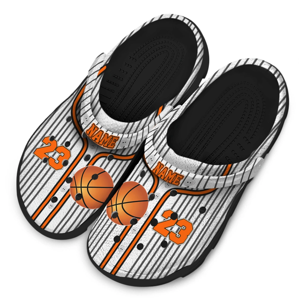 Basketball Logo Clog – Customized Pinstripe Pattern Orange White offers a bold fusion of sporty and casual style, perfect for basketball enthusiasts and streetwear fans alike. Featuring a dynamic pinstripe pattern complemented by bright orange accents and a realistic basketball graphic, these unisex graphic clogs make a statement wherever you go. Designed for those who crave breathable comfort without sacrificing individuality, they are an ideal choice for athletes and hobbyists wanting customized foam slides that stand out both on and off the court.