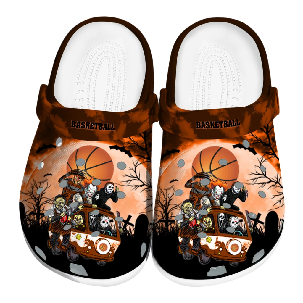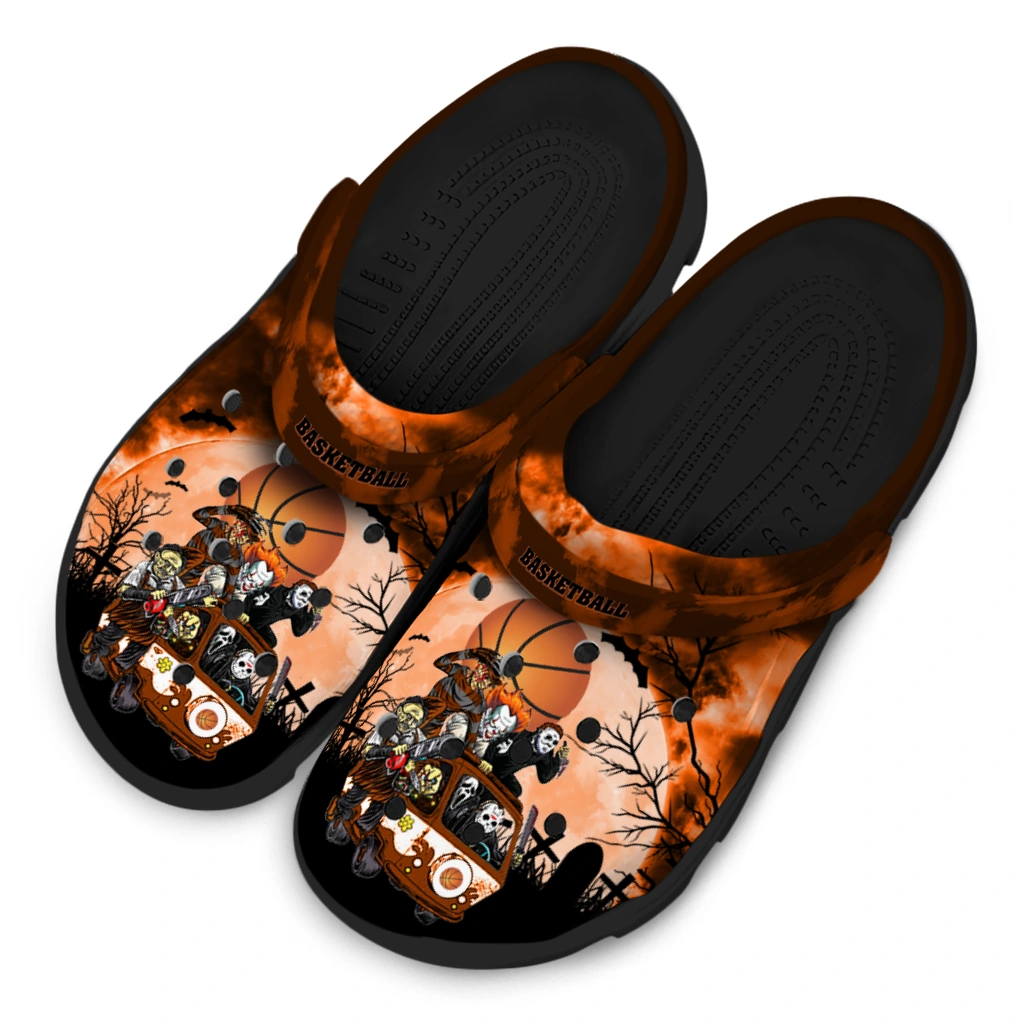 Basketball Logo Clog – Spooky Night Orange Black brings a bold fusion of eerie Halloween vibes and sporty flair to your everyday footwear. Featuring a haunting orange and black palette with spooky silhouettes of night trees and classic horror characters rampaging around a basketball-themed design, these unisex graphic clogs perfectly blend streetwear edge with playful customization. Ideal for basketball fans, casual athletes, and anyone who loves customized foam slides that deliver breathable comfort alongside unique style.