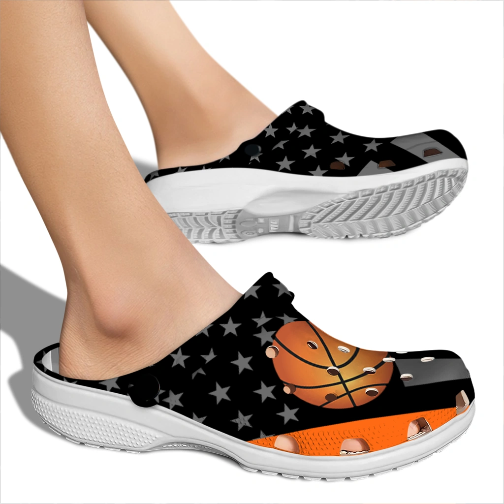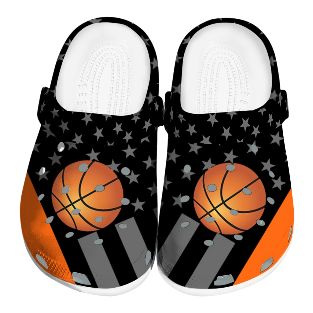 Basketball Logo Clog – Stellar Stripes Theme Orange Black brings a dynamic blend of sporty energy and bold street-style flair perfect for fans of basketball and urban fashion alike. Featuring a striking orange basketball motif set against sleek black and gray stripes layered with subtle star patterns, these unisex graphic clogs make a confident statement for athletes, hobbyists, and anyone craving breathable comfort with a customized edge. Designed to complement both casual and active lifestyles, they deliver easygoing style with standout personality.