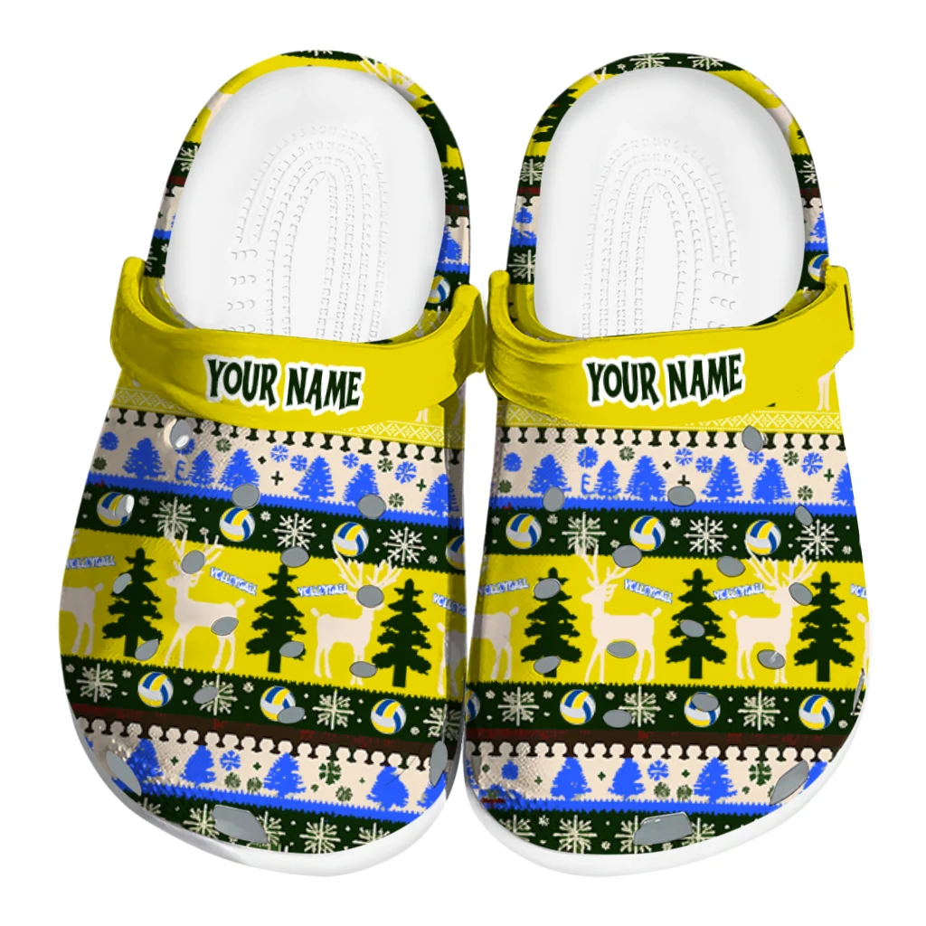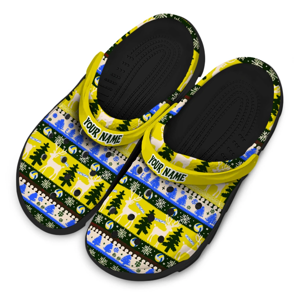 Volleyball Logo Clog – Custom Christmas Motif Yellow offers a festive and sporty twist on classic unisex graphic clogs, perfectly blending holiday cheer with your love for volleyball. The playful Christmas motif features stylized reindeer, snowflakes, and volleyball icons in a vibrant yellow, blue, and green color palette that brings energetic warmth and seasonal spirit. Designed for athletes, volleyball enthusiasts, and anyone craving breathable comfort during the holiday season, these customized foam slides combine standout style with everyday usability.