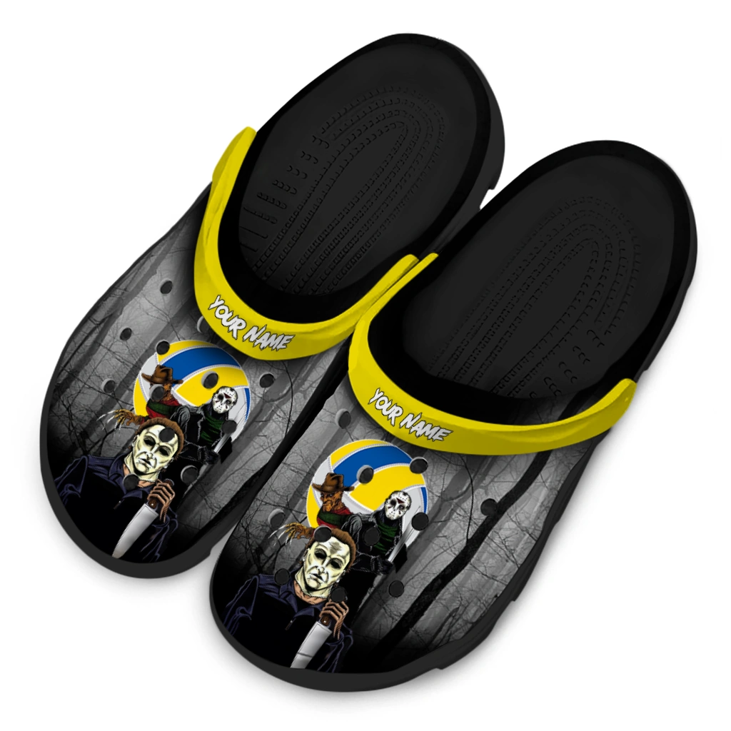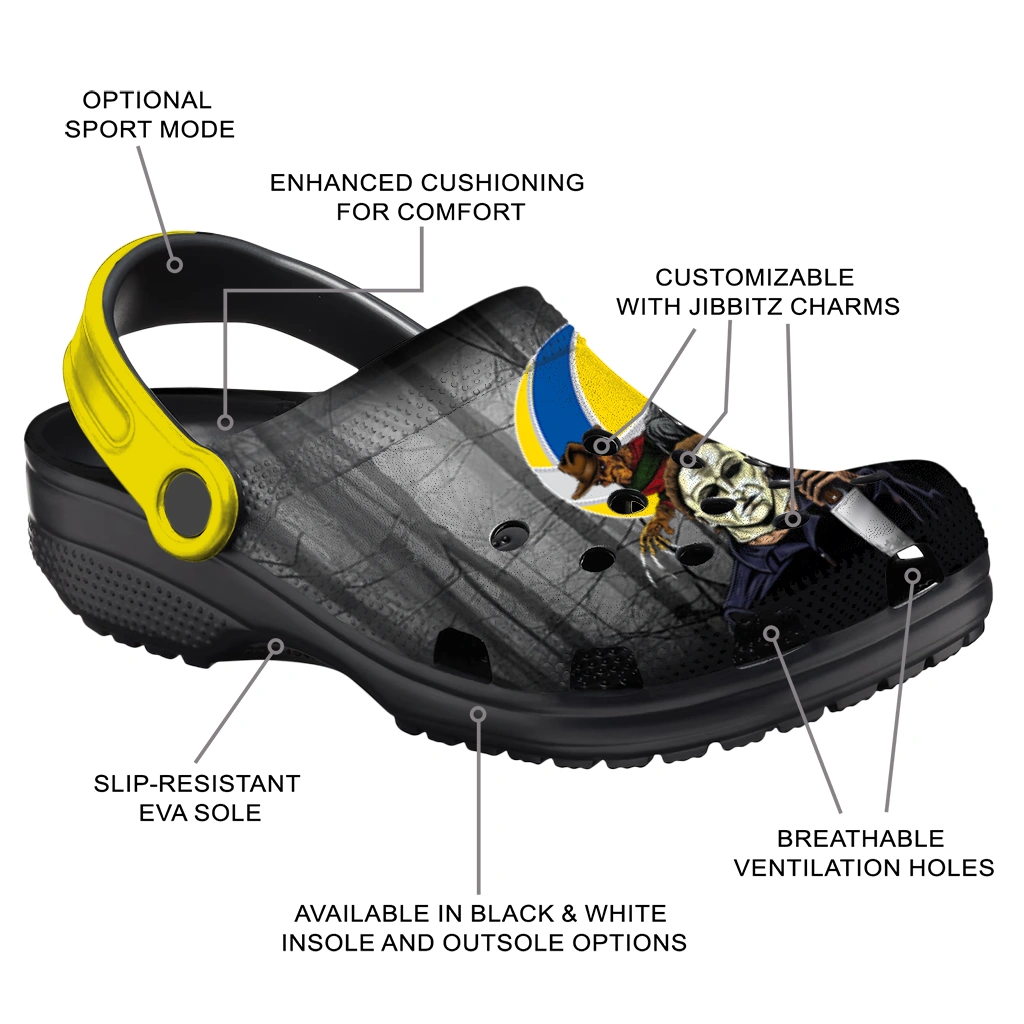 Volleyball Logo Clog – Custom Evil Presence Yellow Black brings a bold, edgy vibe to unisex graphic clogs with its dark, mysterious design featuring iconic horror figures set against a shadowy forest backdrop and a striking yellow-black volleyball emblem. Perfect for athletes and horror enthusiasts alike, these customized foam slides combine breathable comfort with a personality-packed statement, making them an ideal choice for anyone looking to add a unique flair to their casual footwear collection.