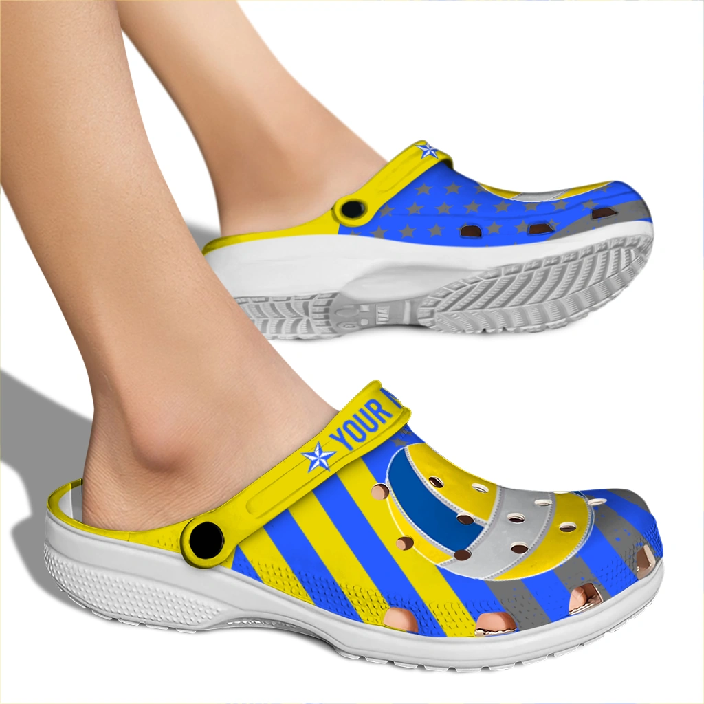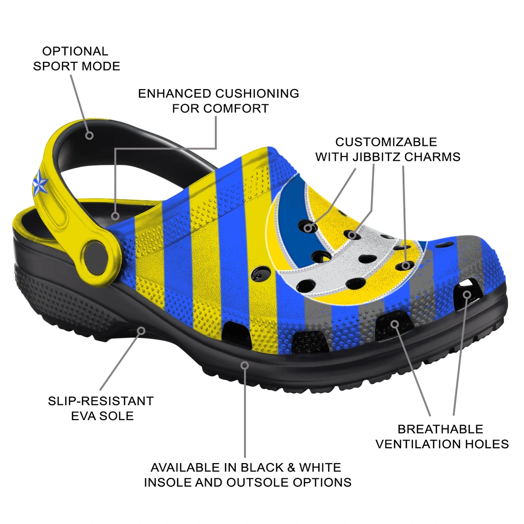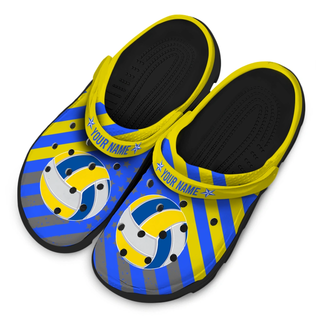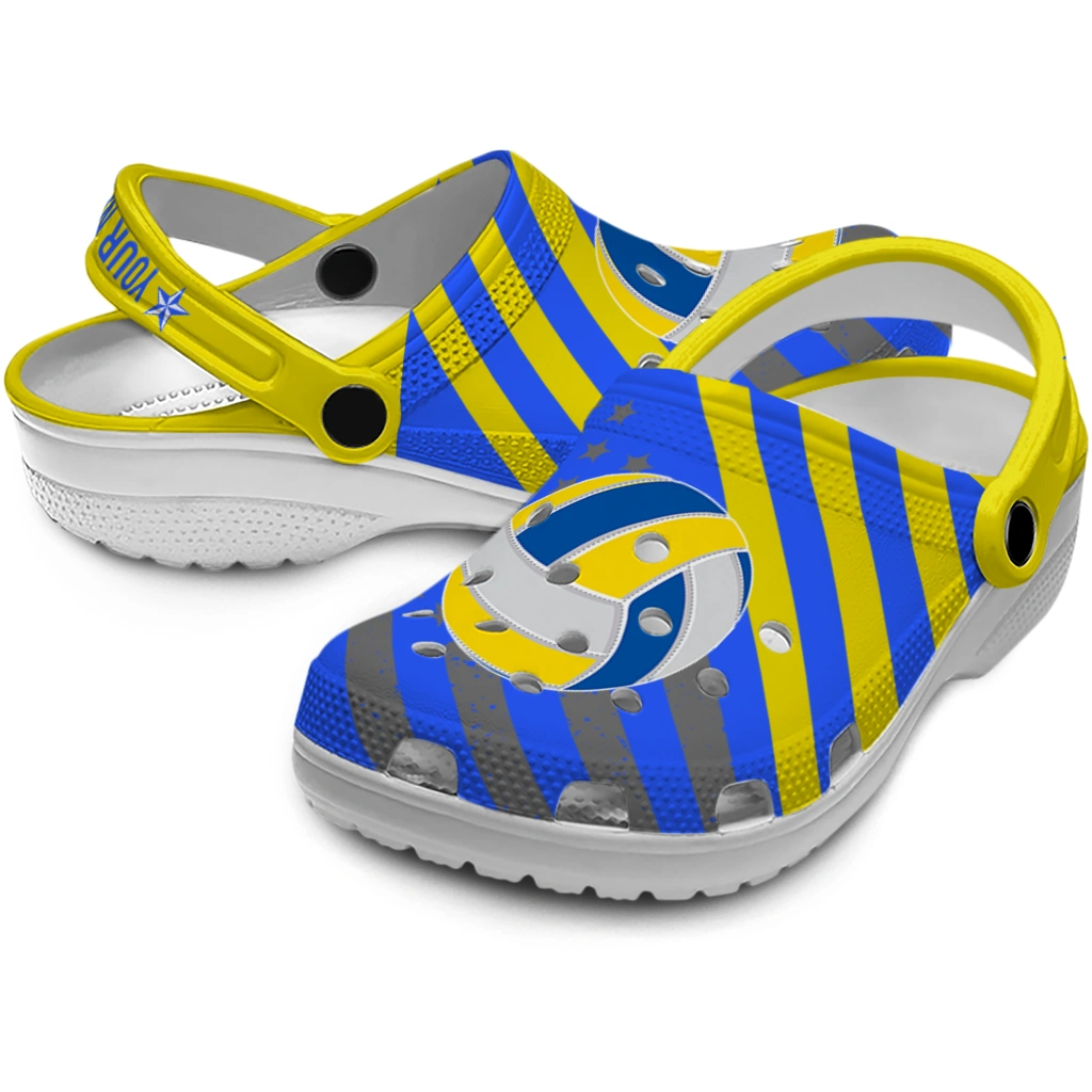 Volleyball Logo Clog – Custom Star-Spangled Graphic Gray brings a bold, sporty flair to your everyday footwear with its striking blue, yellow, and gray palette accented by a dynamic volleyball design and star motifs. Perfectly suited for athletes, volleyball enthusiasts, and anyone who loves unisex graphic clogs that combine personalized style with breathable comfort. These customized foam slides showcase a vibrant, energetic mood that celebrates team spirit and outdoor fun.