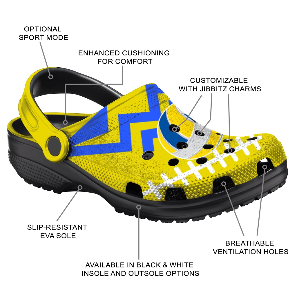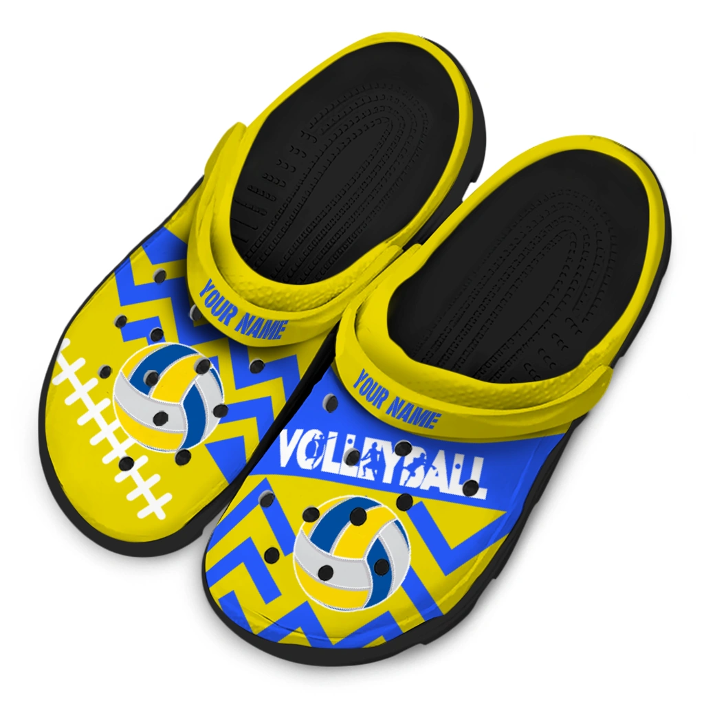 Volleyball Logo Clog – Custom Zigzag Stripes Yellow bring a vibrant and energetic flair perfect for volleyball enthusiasts and sporty trendsetters. Featuring bold yellow and blue zigzag stripes combined with a dynamic volleyball logo, these unisex graphic clogs capture the spirit of the game with a fresh, modern edge. Ideal for athletes who want breathable comfort and a personalized touch, these customized foam slides effortlessly blend sporty style with everyday versatility.