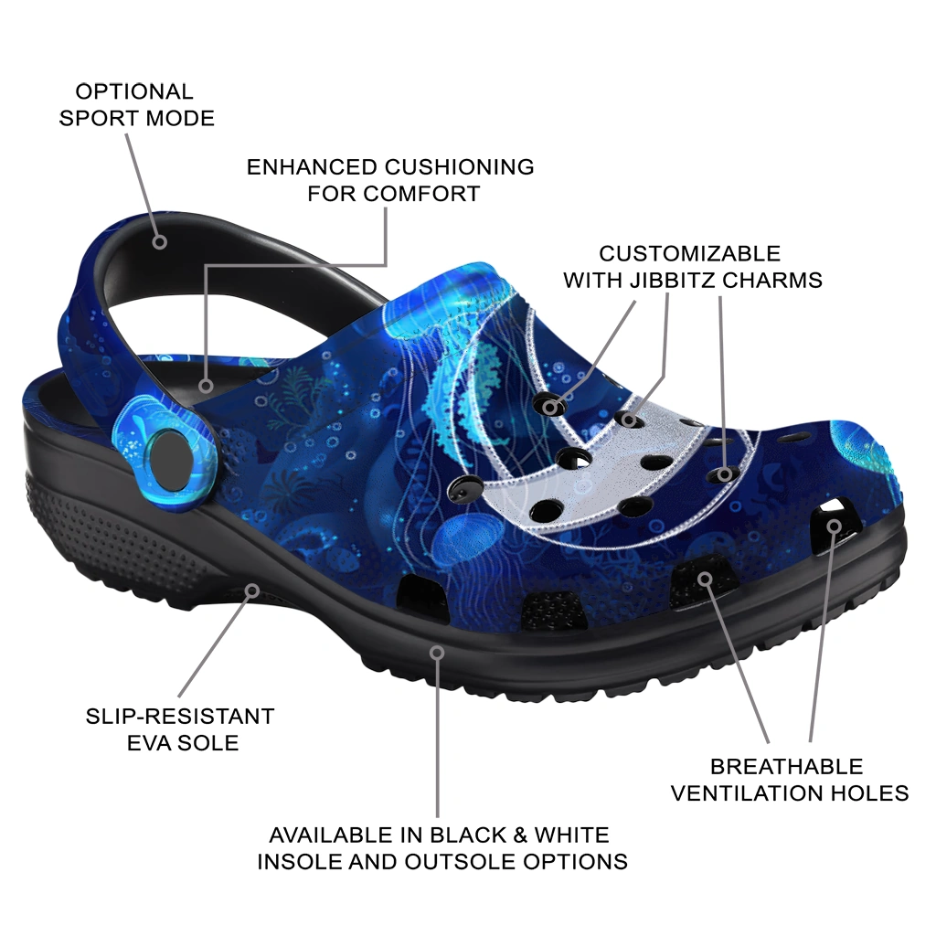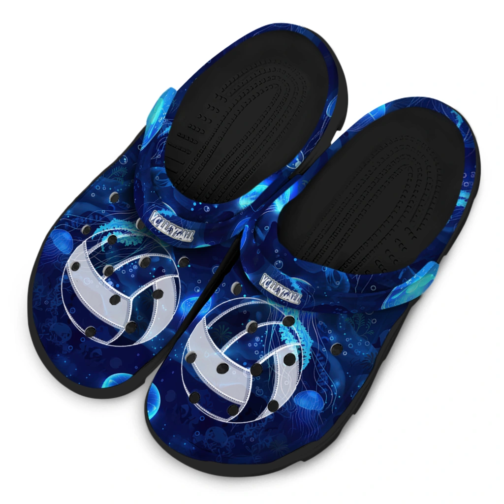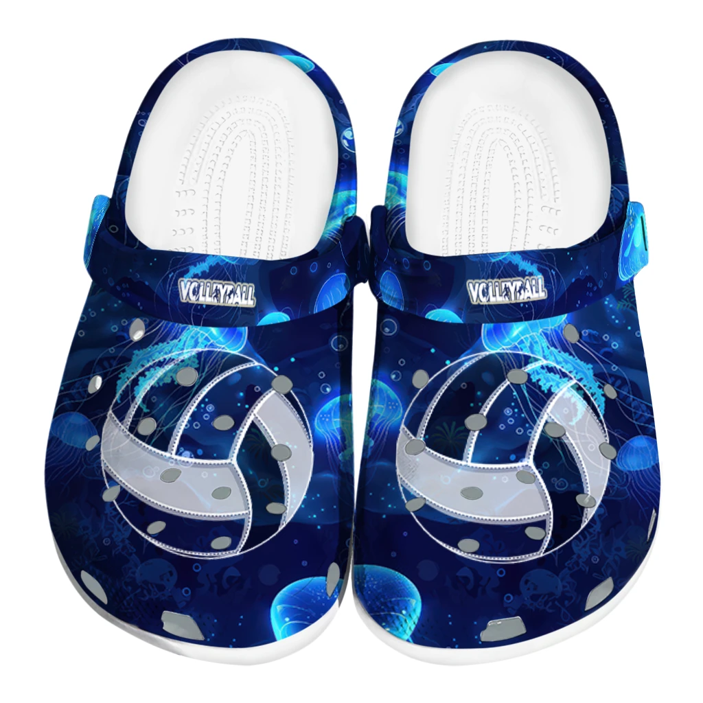Volleyball Logo Clog – Jellyfish Ocean brings together the thrill of beach volleyball with the serene beauty of ocean life in a striking unisex graphic clog design. Featuring a dynamic volleyball motif amid glowing jellyfish and deep-sea blues, these customized foam slides capture a mood that’s both energetic and tranquil—perfect for athletes, ocean lovers, and anyone who enjoys breathable comfort with a splash of aquatic style. Whether you’re hitting the court or relaxing by the water, these clogs make a bold statement while providing everyday ease.